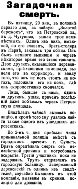 На прошлой неделе полицией был произведен обыск в чайной "Золотой бережок", по Литейной ул. Обнаружено шесть бутылок и две жестяных посуды с водкой. Арендаторами чайной Ольгой и Эмилем Кушкиными был нанять некий Грандт, якобы бывший врач, который, заседая в заведении, прописывал посетителям "стопочку" которую сам моментально и наливал с имевшейся при себе фляжки. По слухам за свою "врачебную" деятельность Грандт получал бесплатный стол и 500 мк. деньгами в месяц. Найденная водка полицией конфискована.