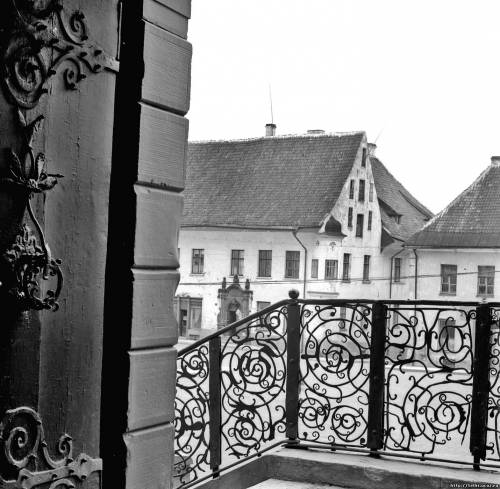 Вид на площадь из дверей ратуши. Фото из собрания Института немецкой культуры в городе Марбург, Германия. Какая-то часть нарвских фотографий собрания сделана, судя по аннотациям к этим снимкам, скорее всего, немецким искусствоведом и фотографом Рихардом Хаманном-МакЛином (Hamann-Mac Lean, Richard (1908-2000)) в 1940 году во время совместной поездки по Прибалтике с немецким искусствоведом, архитектором, инженером Отто Клетцлем (Kletzl, Otto (1897-1945)) с целью фиксации находящихся там памятников германской культуры. Другая часть снимков, явно, сделанных несколько ранее, в 1930-х гг., возможно, приобретена в этой поездке у местных нарвских фотографов.
